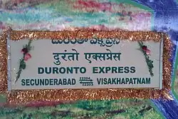 The Visakhapatnam–Secunderabad Duronto Express is a superfast AC express train of the Indian Railways, announced in 2011-12 Railway Budget by Mamata Banerjee, the then Minister of Indian Railways, connecting Secunderabad (SC) to Visakhapatnam (VSKP). It is the fastest way between the two cities and will consist of 18 coaches.[1] On 30 June 2012, the Indian Railways announced that the train will be flagged of on 6 July.[2] It was however flagged off from Visakhapatnam on 12 July 2012.[3]