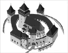 In the 12th century, fortifications began to be built around the chapel. Forming an oval and made of river and field stone, the south, east and northeast walls have survived;[1] these are 7 m in height.[5] The entrance is through the southeast wall, to which two towers and two bastions were added in the 14th century. The south tower, built into the wall exterior, had three floors and a battlement resting on wooden corbels. Sharing a roof with the south bastion, the tower's lower levels were joined into a hall entered from the east. The topmost level kept its parapets, with their oak border and moveable logs that could shut in defenders. The south bastion battlement and roof were joined with those of the south tower.[1]