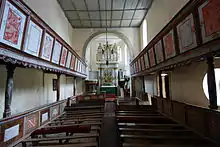 In the 14th century the church became a community church. The apse was replaced by a larger trapezoidal choir. The church was fortified around 1500: the hall was lengthened and linked to the keep, formerly freestanding and probably belonging to the family of a count. Another level was added to the keep, used for bells and fitted with a battlement that stayed on corbels. The roof featured a sixth level with embrasures for firing. The choir's defensive level was demolished in 1743. Due to the peaceful nature of the period, the church battlement was taken down after that time, replaced by grain storerooms for the villagers. The interior ceiling has a ceiling divided into squares, also from 1743, around which time the austere furnishings were put in place.[5]