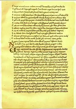 As a source, the Vita Ædwardi Regis was drawn on by later medieval writers. William of Malmesbury consulted it, and his Gesta Regum contains extracts, as does Osbert of Clare's Vita.[15] Sulcard's Prologus de Construccione Westmonasterii, written c. 1085, makes use of the work too, and it is this that enables historians to theorise that a copy of the Vita Ædwardi Regis was at the Abbey of Westminster by this date.[16] More use of the text, if indirect, was made by the famous Cistercian Northumbrian, Aelred of Rievaulx. Ailred's Vita S. Eduardi Regis et Confessoris was the most widely circulated hagiography of Edward, and all later accounts of Edward's miracles and life are based on this.[17] Book iv of Richard of Cirencester's Speculum Historiale de Gestis Regum Angliae is a compilation based on the Vita by Aelred, and contains extracts of the Vita Ædwardi Regis, some of which – roughly 500 words regarding Edith's marriage to Edward – are unique and probably represent part of the lost sections of the original Vita Ædwardi Regis.[18]