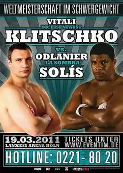 Vitali Klitschko vs. Odlanier Solis was a heavyweight fight for the WBC heavyweight title. The fight was official confirmed on January 11. It took place on March 19, 2011. The location for the fight was Lanxess Arena, Cologne, Nordrhein-Westfalen, Germany.[1]