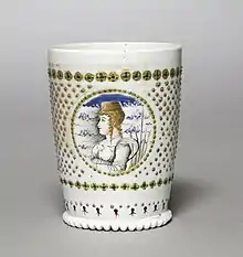 Later artists produced various works in the aftermath of Carpaccio's death and were inspired by his oeuvre. For instance, Paris Bordone's The Presentation of the Ring (1534), an oil painting, echoed Carpaccio's broad compositions, accurate representation of textiles and fabrics, and representation of a gathering of a confraternity.[12] Carpaccio also influenced the glassware industry of sixteenth-century Murano.[26] For instance, collections of milk-glass tumblers, especially those depicting brides to celebrate engagements, drew heavily from his painting Two Venetian Ladies (c. 1490).[26]