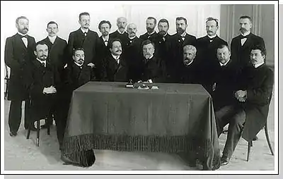 V. I. Kovalevsky (sitting, center) and members of the first soviet of the Polytechnical university. 1902.