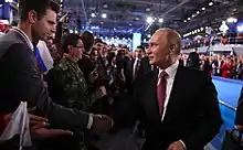 It was assumed that Putin would announce his nomination on 14 December 2017, during his annual press conference.[7] However, at the beginning of December 2017, some experts said that Putin would announce his participation in the elections on 6 December, during the Volunteer of Russia 2017 awards. Putin's press Secretary Dmitry Peskov, commenting on these reports said that Putin could announce the nomination any day. On 6 December, after the presentation of awards, Putin declined to answer the question about participation in the elections, saying that in the near future he will decide on whether to participate in the election.[8] A few hours later, speaking to the workers of the GAZ automobile plant, Putin announced that he will again run for president.[9]
