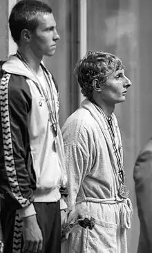 The Soviet Union boycotted the 1984 Summer Olympics in Los Angeles, so Salnikov could not defend his title. Salnikov went back to Seoul in 1988, aged 28, when he was considered too old. He had set a world record in 1986 in the 800 m, but since then never returned to his former form: he finished fourth in the 1,500 m at the 1986 world championships, and failed to reach the final at the 1987 European championships.[4] His pre-Olympic results did not meet the standards set for the Soviet Olympic team, and he was included in the team only by intervention of Soviet officials.[1] Salnikov did not fail, and won the 1,500 meters race, though he later admitted that in that race he went flat out and swam the last 20–30 metres in a blackout state. That night, when entering the Olympic Village restaurant, he was awarded a standing ovation by the other athletes.[2][3]