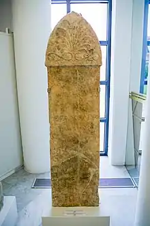 In total 13 inscriptions have been published from the area of Vlochos.[2]: 1–8 [20] The oldest is an early Classical dedication to Poseidon by Kinon, an archegetes, written in the local Thessalian alphabet. The inscription was found during roadworks in the 1930s, and is presently exhibited at the Archaeological Museum of Almyros.[21]: 16–18 An additional four dedications to unknown deities was found during rescue work in the 1960s, ranging from the early 4th to the 3rd century BC. Three funerary stelai have been recovered from the fields south of the ancient city, all of the 3rd or early 2nd century BC. Two, those of Megalokleas and Nikasippos son of Nikias, are displayed in the foyer of the Archaeological Museum of Karditsa.[22]
