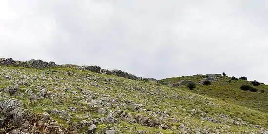 The first identified traces of building activity at the site consist of a large fortified enclosure in rubble masonry on the hilltop. The fortification walls of this phase originally stretched for 1.5 km with a width of 2.7 m. The maximum preserved height of this wall is 2.5 m, but it probably had a considerable mud brick superstructure.[1]: 28-31 No towers have been found, but two large gates provide access to the fortified space from the west and southeast.[1]: 31–32