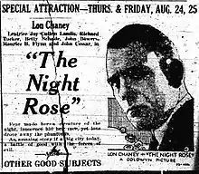 In 1921 when The Night Rose was released, many American cities and states had enacted their own film censorship laws. Because of its crime plot, The Night Rose was subjected to censorship, and was the first film rejected in whole by the recently created New York State Motion Picture Commission[7] which it condemned "as highly immoral and of such character that its exhibition would not only tend to corrupt morals, but to incite crime."[8] Goldwyn appealed the decision to New York state court, which upheld the commission's decision on November 18, 1921.[1] Goldwyn then came to an agreement with the state commission to edit the film, which removed many of Lon Chaney's scenes and inexplicably changed the name of his character from Red O'Rourke to Duke McGee.[9][7] The film was finally released in December 1921 under the title Voices of the City.[9]