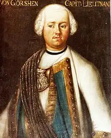 Görschen is an old German noble family originating from the 12th century. The family name derives from its original headquarters: the place Goresin (Görschen) or even from an older "oppida goresin" (Görschenburg / Görschenfestung) near Lützen, which was already appointed by Bishop Thietmar of Merseburg in the year 998, whereas the name itself is Sorbian origin and translating as "damp". Naming variations are de Goresin, de Gorsne, de Gorssen and von Goerschen.