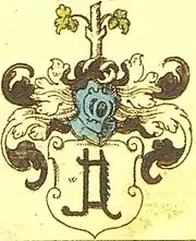 The coat of arms shows a fireplace trammel hook. On the helmet with black and silver covers is standing a natural short oak branch with hanging green leaves on both sides.