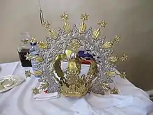 A votive crown is a votive offering in the form of a crown, normally in precious metals and often adorned with jewels. Especially in the Early Middle Ages, they are of a special form, designed to be suspended by chains at an altar, shrine or image. Later examples are more often typical crowns in the style of the period, either designed to be placed on the head of a statue, or re-used in this way after donation.