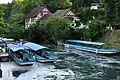A bridge was leading from the righthand shore of the Rhein river into the ring the walled courtyard. On the north side a palace-like building was built, whose third floor consisted of a cantilevered clerestory timbered. In 1621 a stone floor replaced the clerestory. New floors were added, new windows broken, and the ring wall and gate was broken. As of today it houses the restaurant Schlössli Wörth that claims to be a gourmet restaurant, and also a gift shop and a fast food joint, connected with a terrace and a brilliant view of Rheinfall.[2] Wörth is also the starting point of the Rheinfall tour boats.