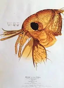 His coloured lithograph, 'Head of a Flea', was presented to the Entomological Society of London on 7 May 1838, who adopted it for a poster. Reade's letters to his contemporaries describe how Aldous began his illustrations of microscopy with this illustration, after a drawing, “highly magnified figure of the head of a flea” (1837), derived from his experiments in microscopic photography.[3] Other works included a portrait of the microscopist and histologist John Thomas Quekett.[4]