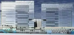 In January 2006, it was announced that the project had received $232.5 million in pre-development financing from Société Générale Corporate and Investment Banking.[3][4] Project details were announced in May 2006. The property would include two 50-story glass towers with a modern design, containing a combined total of 4,000 hotel and condo-hotel units, ranging from 500 sq ft (46 m2) tp 3,000 sq ft (280 m2). Prices would start at $650,000,[5] and the total cost of the project had increased to $2.5 billion.[5][6] It was also announced that Las Vegas' M.J. Dean Construction had been hired as the general contractor, while Las Vegas-based Klai Juba Architects would work with the New York-based Lacina Heitler Architects to design the project along with Charles Allem Designs. Utility installation work had already begun early that month, and M.J. Dean Construction had begun building a $5 million residential sales center.[4]