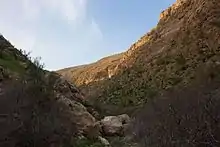 Wadi Auja is 35 kilometers long and sets the boundary between the Desert and the eastern hillslopes of the West Bank. It has a drainage area of 200 square kilometers and descends from a height of approximately 1000 meters above sea level to -315 meters below sea level, where it flows into the Jordan River. The stream starts at Ein Samia, on the eastern slopes of Mount Hazor and flows eastward. Before its arrival to the Jordan Rift Valley, it forms a deep and steep gorge, some 3 kilometers long. In this area some waterfalls are formed.[3] Ein Samia has been diverted to provide water to Ramallah, some 20 km away, providing around 30% of the city's needs, and leaving most of the Wadi dry throughout the year.[4] The Auja Spring produces an estimated 9 million cubic metres of water annually, which creates a small oasis that attracts thousands of tourists a year, as well as providing for the farmers of Auja village.[5]