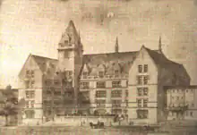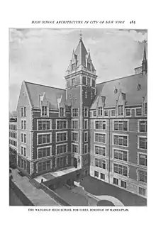 Five stories tall, the building had such wonders of the times as electric elevators and central forced-air ventilation. The architect of the school was C. B. J. Snyder, who, as Superintendent of School Buildings for New York City, was responsible for the design of most of the New York City public schools of the time, including such notable buildings as DeWitt Clinton High School and Erasmus Hall High School. The brick-and-limestone school, done in a French Renaissance style, featured an imposing tower, stained-glass windows, and a series of terra-cotta bas-relief shields with patriotic American motifs.[6] In 1993 a renovation, costing $47 million, was completed.[7] The following year, Wadleigh was designated a New York City Landmark.[8]