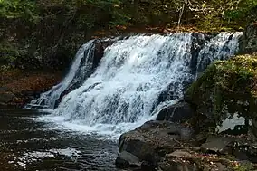 Two natural waterfalls lie within easy reach by park trails: the Big Falls,[7] on the Coginchaug River, and the Little Falls,[8] on Wadsworth Brook. The larger of the two, Wadsworth Big Falls, drops the 52-foot breadth of the Coginchaug River some 30 feet (9.1 m) over a shelf of Hampden basalt.[9] Wadsworth Little Falls is found along Wadsworth Brook and descends approximately 40 feet (12 m) over an outcrop of sandstone known as Portland arkose.[9]