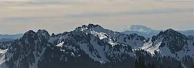 Left to rightː Lane Peak, Wahpenayo Peak (centered), Mount St. Helens, and Chutla Peak in winter.