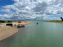 The area used by the boat ramp (since 2001)[6] and car park is part of a delta formed by the river.[7] Shingle was taken off the delta from at least 1920[8] to 1937.[9] The 219 ton[10] Devonport Steam Ferry paddle steamer Eagle[11] (1886-1924)[12] was on the beach at least from 1925[13] to 1927.[14] Former Auckland tram bodies were moved to the south end of the delta in 1953 for use as holiday baches.[15] Ngāati Tamaterā regained the delta and other areas under a Settlement dated 20 September 2017,[16] following Land Court irregularities dating back to 1878.[6]