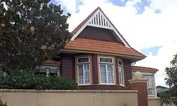 Wairuna is a substantial mostly one storeyed elevated timber building on a prominent site in Hampstead Road, Highgate Hill. The building has a complex steeply pitched hipped and gabled roof clad with red Marseilles patterned terracotta roof tiles. Gabled projections on the roof give external expression to bay windows and other projections which would otherwise be concealed by verandahs. The gabled projections on the roof are clad with a variety of small terracotta tiles or horizontal timber boarding. The projections have decorative bargeboards partially infilled with either vertical timber battening or cross braced timber members.[1]