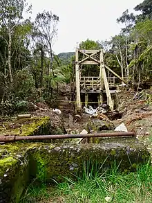 The lower part of the valley was exploited for gold, the upper part for timber. From 1898 to 1928[11] the Waihi Gold Mining Co,[12] then the Kauri Timber Co,[13] and, finally, the Waitawheta Sawmilling Co, from 1923, used a 19 km (12 mi), 825 mm (2.707 ft; 32.5 in) gauge[14] (or 5 ft 3 in (1,600 mm))[15] tramway to the East Coast Main Trunk near Owharoa,[14] to remove 9 million feet (rather more than 2,000 trees) of mostly kauri logs.[16] Milling ended in 1928 when nearly all the trees had been removed and the tramway was then dismantled.[17] Since 2006, most of the 8 bridges over the river have been replaced by suspension bridges for walkers[18] along the remaining 14 km upper part of the tramway.[11] Waitawheta Hut was moved[19] in 2004[20] to the site of the Waitawheta Sawmill,[11] just above the Toilet Bowl waterfall.[21]