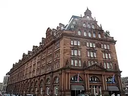 The Caledonian Hotel, constructed from 1899 to 1903, was part of the Caledonian Railway's Edinburgh Princes Street railway station. It was a rival to the North British Railway's North British Hotel, which opened at the other end of Princes Street in 1903.[4] The hotel was built on top of the stone, V-shaped station building that had been recently built as a replacement for the previous wooden station, which was damaged in a fire in June 1890.[2] The architects of the hotel were John More Dick Peddie and George Washington Browne.[3] Peddie's assistant and job architect was John Wilson.[5]