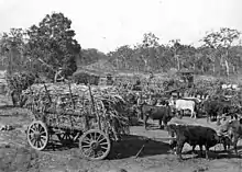 Sugar cane waiting to be loaded onto the train at Walligan railway siding, c.1924