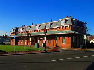 The depot at Wallingford was built in 1871 by the Hartford & New Haven Railroad on the Springfield Line, and was built in a French Second Empire style similar to that of the Windsor train station.[5]