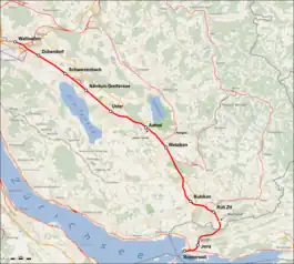 The line runs from Wallisellen, where it diverges from the Zurich to Winterthur line, to Uster and Rapperswil. A second link from Zurich, via the Zürichberg Tunnel, joins the line just before Dübendorf, and both routes are used by through trains from Zurich. The line also has junctions with the Effretikon to Hinwil line, at Wetzikon, and the Tösstalbahn, at Rüti. At Rapperswil, it connects with the Lake Zurich right bank line, the Rapperswil to Ziegelbrücke line, and the Südostbahn over the Seedamm.[2]