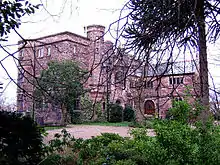The house is built in red sandstone with a grey-green slate roof. It is Elizabethan in style and has a T-shaped plan. The main wing is elaborate and overlooks the river to the west; the unfinished servants' wing is simpler and looks to the north. The entrance faces the east. The entrance porch has two storeys with an arched entrance and an oriel window above it.[1] The room above the porch was used by Douglas as an oratory or chapel.[6] To the left is a squat three-storey tower and between the two is an octagonal corbelled stair-turret. To the right of the entrance porch the house continues for two bays leading to the servants' wing at right angles. These are in two storeys with mullioned windows.[1]
