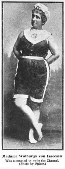 Walpurga von Isacescu attempted to swim across the English Channel on 5 September 1900, a generation before the first woman succeeded at the challenge (when Gertrude Ederle did it, in 1926). She is considered the first woman swimmer to try.[1] Unfavorable weather and tides[2] contributed to her failure after ten hours, and twenty miles.[3][4][5] She announced plans for another attempt in 1903.[6]