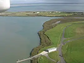 The Pūkaki Creek seen from an airplane. Auckland Airport is in the foreground, with South Auckland and the Hunua Ranges in the background.