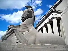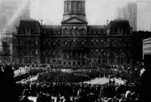 Two years after being rebuilt, the theatre was overwhelmed by the massive sized pile of marble and granite French Second Empire styled architecture with construction across the street to the west in the new domed Baltimore City Hall of 1867–1875 by George A. Frederick, (1842–1924), a municipal architect who also designed a lot of the structures in the new Druid Hill Park (established 1860) and other city structures. By the time that the theater and its surrounding block (Holliday to Fayette to North Gay to East Lexington Streets) was torn down in 1917, based on the 1910 plans of Frederick Law Olmsted, to make room for the newly laid-out War Memorial Plaza and Building, as a major rearrangement of a proposed new "civic center" of flanking municipal office buildings and structures providing additional space to be used in future decades, covering up the then unsightly canalized stream of Jones Falls to the east with its periodic flooding problems, and to open up a vista of the elaborate east front of the Baltimore City Hall, an influence of the then-nationwide "City Beautiful" movement among architects and city planners then coming to rise.[1] The War Memorial Building was designed by local famous architect Laurence Hall Fowler and originally dedicated to Marylanders who died in World War I and built in the early 1920s, dedicated 1925 and is one of many World War I Memorials for "The Great War" throughout the world built in the various participating Allied nations since the conflict of 1914–1918.