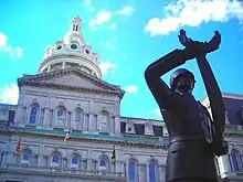 "Negro soldier" statue by sculptor James E. Lewis from 1971 in front of east side of City Hall, relocated 2007 from Battle Monument Square