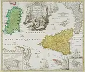 Sardinia (green) and Sicily (yellow) on a 1720 map.