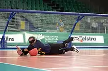 ![]() Warren Lawton saves a penalty shot during a goalball game for Australia against Sweden at the 2000 Sydney Paralympics. | |