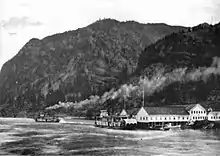 The sternwheelers Tahoma (moving upstream) and Dalles City (at dock), at the Warren salmon cannery in 1902. Photo by Benjamin A. Gifford.
