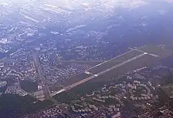 View of the airport from the air to the southwest. The photo draws attention to Powstańców Śląskich Street which is a street on the path of the former second runway. The paved runway 10R/28L in use is only a part of its former length.
