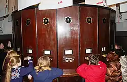 The Warsaw Fotoplastikon has 24 fixed stereoscopic viewports. A visitor sits at a viewport around the circumference of the machine. Each picture, from a sequence of 48 three dimensional stereo images, appears for 15 seconds before moving on to the next. Above each viewport is a window which displays an illuminated card with a brief description of the scene below. The scenes are arranged by themes, such as a travelogue to distant lands or depictions of historic events. Recorded music related to the theme plays in the background. The Fotoplastikon uses a slightly modified version of the Kaiserpanorama peepshow system, differing in having 24 viewports instead of 25 in the Kaiserpanorama system.[1]