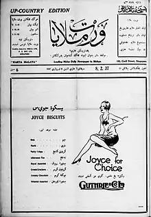 Warta Malaya (English: Malayan Report), also known as Warta Melayu was a Singaporean and Malayan Malay-language daily newspaper.[1] Written in Jawi script, the newspaper released its first issue in 1930. It later emerged as one of the highest circulating Malay newspapers of the 1930s.[2] The newspaper was politically involved in the early stages of Malay nationalism, and became a paper for the Kesatuan Melayu Muda, an early Malayan left-wing political party.[3] The final issue of the newspaper was published in 1942.[4]