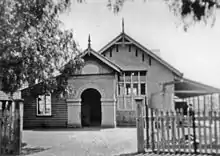 The eastern, principal, elevation features a projecting gable with two narrow lancet windows with a small arched window above them and a centrally positioned circular air vent. A similar arrangement of vent and lancet windows is found at the western gabled end of the building. On the northern and southern gable ends there are sets of three narrow lancet windows. Above each set is a small arched window. The eastern elevation has five large square windows to both northern and southern wings on either side of the projecting gabled entry porch. On both sides of each wing are open verandahs. The southwestern section is enclosed and incorporates a timber extension now used as a tuck shop.[1]