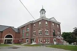 The Washington County Jail is located in the center of Machias, on the north side of Court Street, midway between Center and Cooper Streets. It shares the block with the Washington County Courthouse, to which it is connected by a modern ell at the rear. The jail is a three-story brick building with a hip roof and a granite foundation. A gabled entrance pavilion projects slightly from the south-facing front, and there is a cupola at the center of the original building, which has been greatly enlarged by a modern addition to the rear. The main entrance is on the second floor, which is separated from the first by a granite string course. Windows and doors on the upper floors are set in recessed panels, rounded on the third floor and arched on the second. The rounded-arch paneling is continued in a sympathetic way in the modern addition.[2]