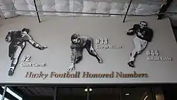 94. "UW To Add Display For Honored Football Numbers In Husky Stadium" (Press release). University of Washington Athletics. July 26, 2021. Archived from the original on July 26, 2021. Retrieved April 30, 2022. Those three "honored numbers" will be on public display for the first time in program history, giving reverence to the fact that each of them had been considered "retired" during some portion of the last century. [...] Those three players' numbers were retired after their college careers ended, though each has been worn from time to time over the years.