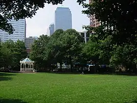 Washington Market Park. The towers of the World Financial Center can be seen in the background (center, skyline).