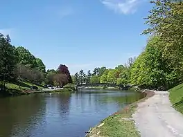 Washington Park Lake is a body of water in Albany, New York located in the southwestern corner of Washington Park. It has a surface area of 5.2 acres (21,000 m2) and a mean depth of 6.6 feet (2.0 m). The deepest sections of the lake are just over 11 feet (3.4 m) deep.[1] The lake is roughly 1,600 feet (490 m) long and 140 feet (43 m) wide. [2][3] Next to the lake is the Washington Park Lakehouse and an amphitheater where the Park Playhouse performs musicals in the summer. A wrought-iron pedestrian bridge spans the lake at its narrowest point. The footbridge over Washington Park Lake is the only remaining original structure in Washington Park. Erected over the lake in 1875 the lamps on the bridge were originally gas burning but were electrified in 1881.[4] Ice skating is permitted on Washington Park Lake, though swimming is prohibited.[5]