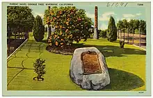 The Parent Washington Navel Orange Tree is a tree grown by Eliza Tibbets in Riverside, California, in 1873. The Riverside County tree was designated a California Historic Landmark (No.20) on June 1, 1932, at the corner of Magnolia Street and Arlington Street, Riverside.[1] The Bahia, Brazil, Washington navel orange was brought to the United States by the U.S. Department of Agriculture in 1870. The Department of Agriculture imported twelve trees; from these trees, some buds were grafted on to California sweet orange trees. The Washington Navel Orange is also called California Navel Orange.[2]