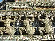 The central prang symbolises Mount Meru of the Hindu cosmology.[12] The satellite prang are devoted to the wind god, Phra Phai. The demons (yaksha) at the entranceway to the ubosot are from the Ramakien. The white figure is named Sahassa Deja and the green one is known as Thotsakan, the Demon Rāvana from Ramayana.
