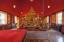 There is the Thai monogram of King Rama IX, "Phor Por Ror" (ภ.ป.ร.) on the gable of the new ordination hall. The dwelling for monks and Thai-style sermon hall were all built from teak wood. There is also a stūpa where the holy relic of Lord Buddha was put inside. This stūpa was built in 1974, Princess Maha Chakri Sirindhorn came to solemnize raising Chatra (tiered umbrella) ceremony on December 7, 1980. Inside the ordination hall, there is a principal Buddha image in Māravijaya posture, made of mixed brass and gilded lacquering named Luang Pho Ket Champa Si (หลวงพ่อเกศจำปาศรี). In addition, there are also various idols of Chinese god such as Guanyin, Kātyāyana to be worshiped as well.[1]
