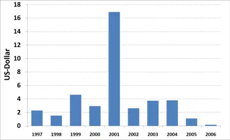 According to the Honduran ministry of finance, US$262 million were invested in the sector between 1997 and 2006, which is on average US$4 per capita and year. The annual investment mostly ranged from US$1.1 and US$4.6 per capita. In 2001 it was extremely high, reaching US$16.9. On the other hand, in 2006 it was at only US$0.2 per capita[30] On average, the investment level is similar to Costa Rica and Mexico, but lower than South American countries like Argentina, Peru and Colombia.[31]