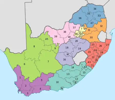 Municipalities. According to the Constitution, the Municipal Structures Act and the Water Services Act of 1997[49] responsibility for the provision of water and sanitation services lies with water services authorities, which the Water Services Act defines as the municipalities. There are 52 district municipalities and 231 local municipalities in South Africa (see Municipalities of South Africa).[50]
